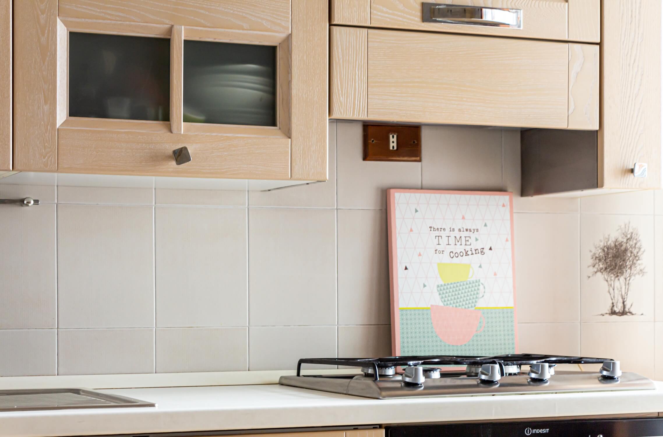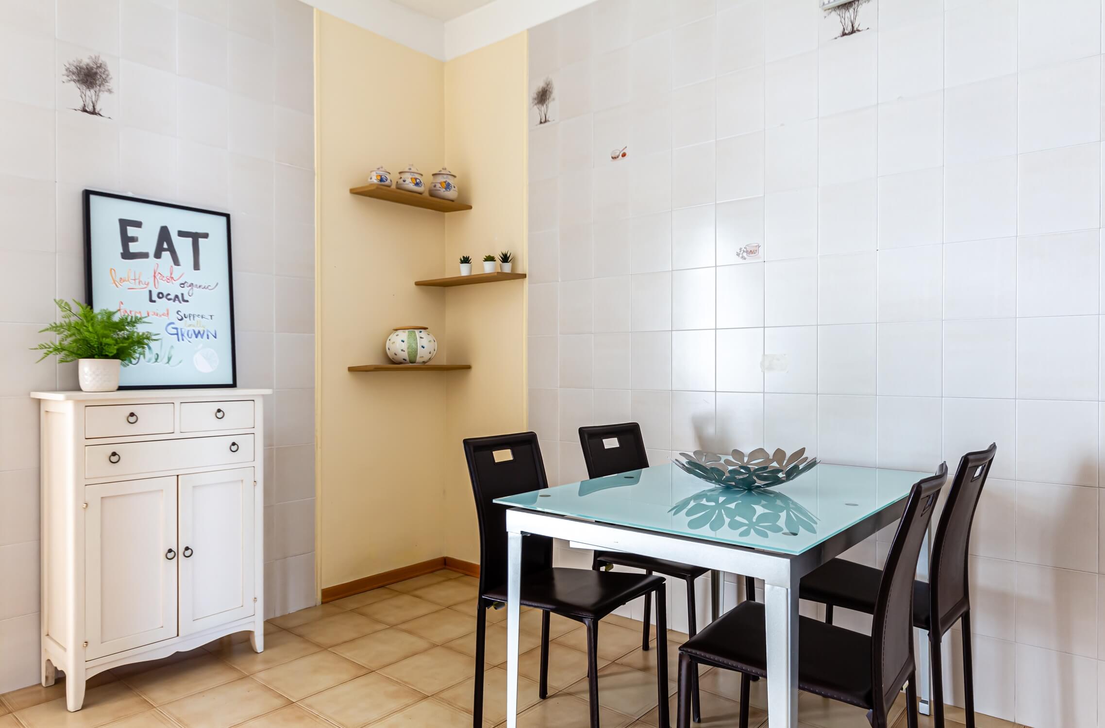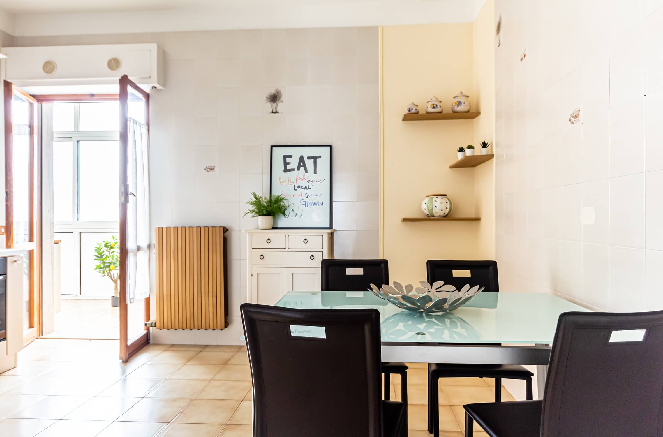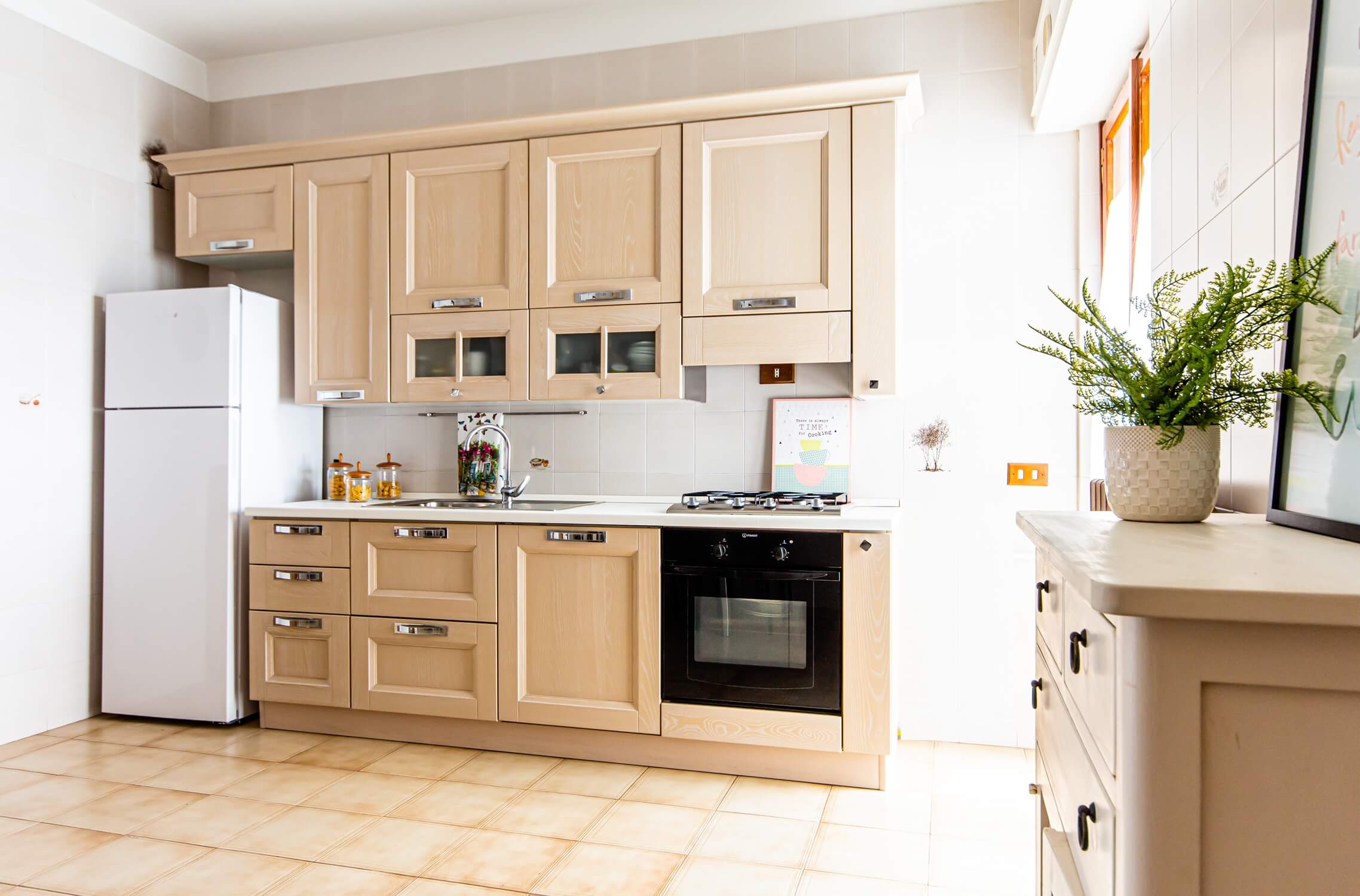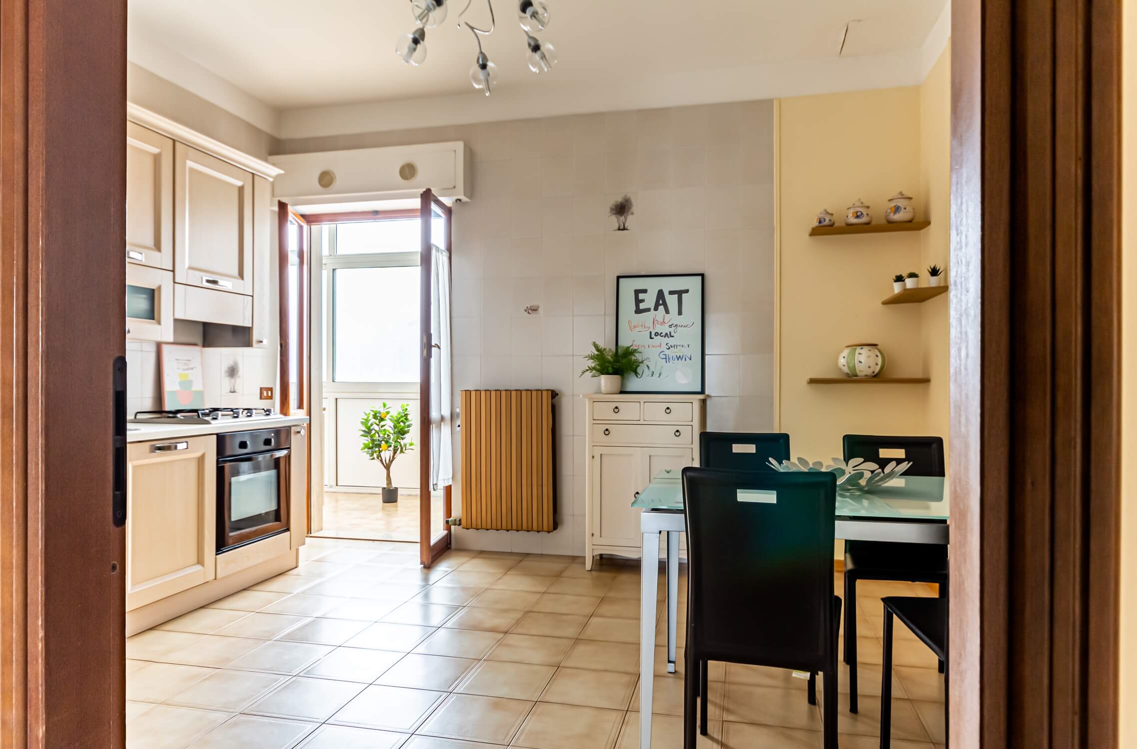 La cucina affaccia su di un balcone interno, dov’è presente un ripostiglio.